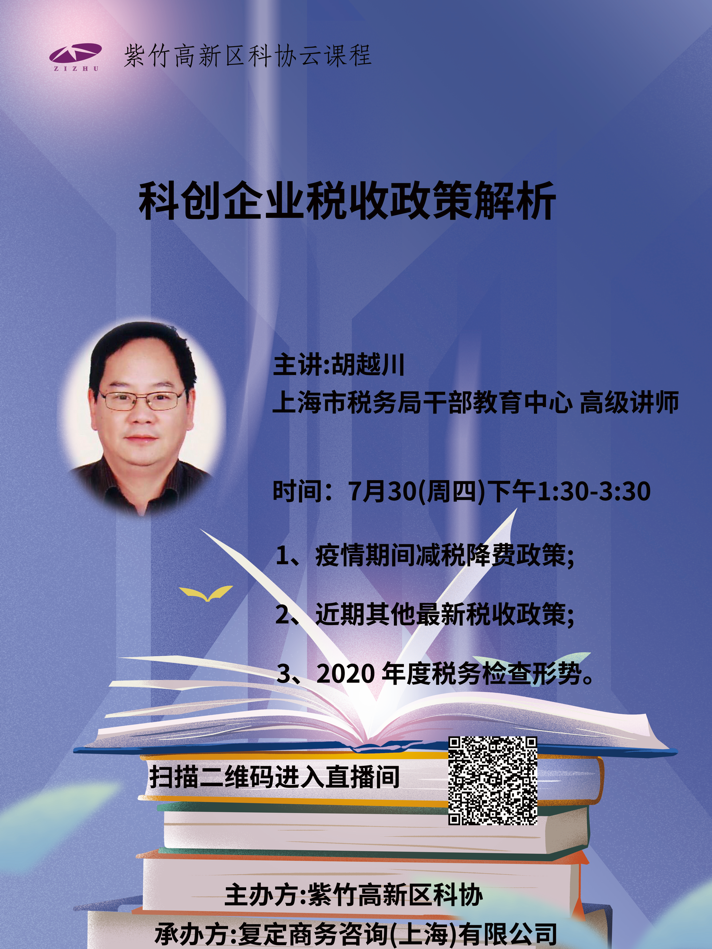 2020年7月30日下午1:30-3:30紫竹高新區(qū)科協(xié)將舉辦云課程《科創(chuàng)企業(yè)稅收政策解析》,特邀上海市稅務局干部教育中心高級講師胡越川作為主講人,講授疫情期間減稅降費政策,近期其他最新稅收政策,2020年度稅務檢查形勢等相關內容,歡迎屆時掃碼參加。