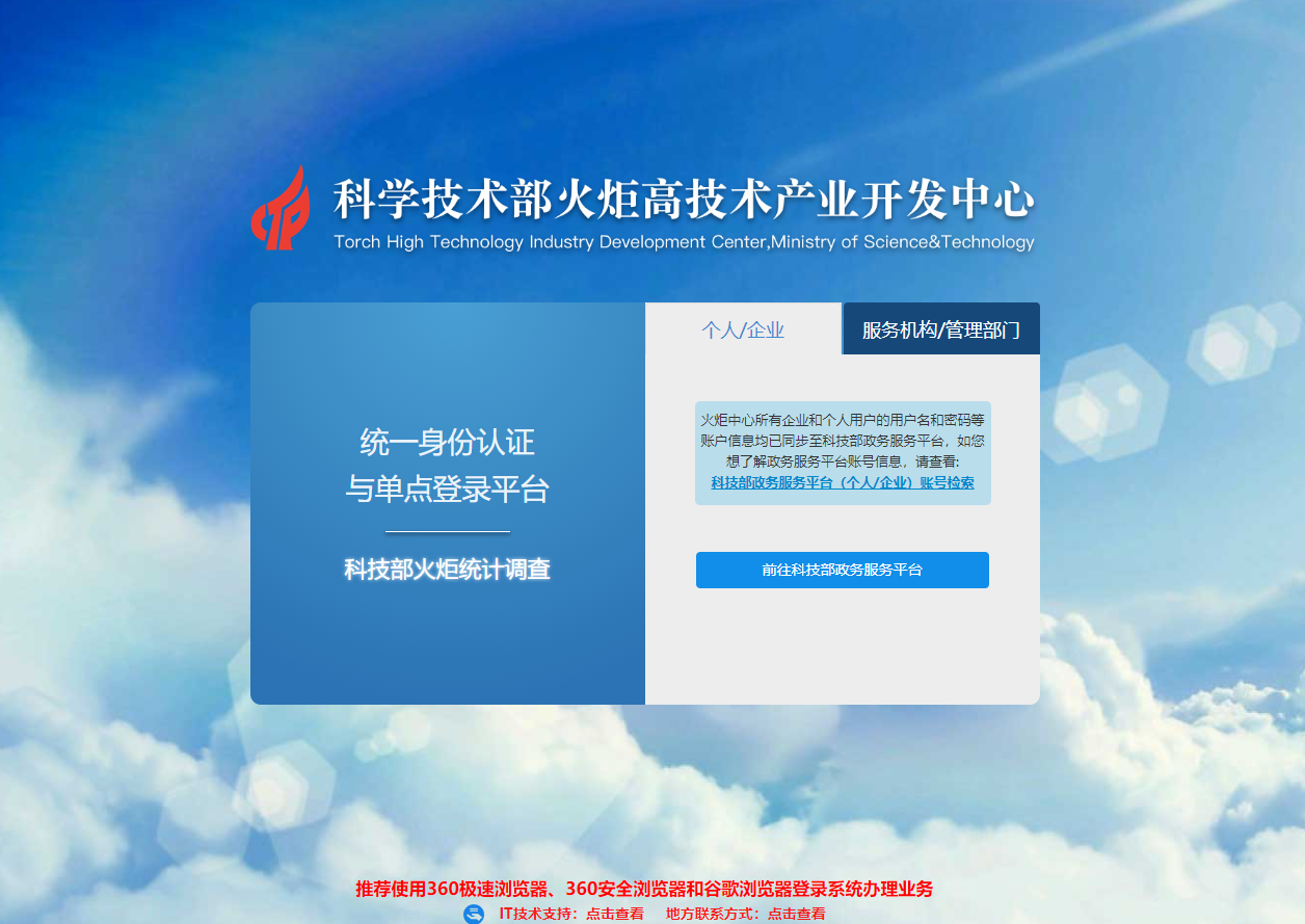 2.新注冊企業(yè)參照科技部火炬中心統(tǒng)一身份認證與單點登錄用戶轉(zhuǎn)移到科技部政務(wù)服務(wù)平臺登錄使用說明辦理注冊登錄,登錄后選擇“科技部火炬統(tǒng)計調(diào)查”-“我要辦理”。