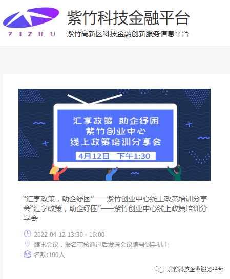 為助力園區(qū)企業(yè)渡過(guò)疫情難關(guān),對(duì)接金融資源,了解園區(qū)特色政策,紫竹科技金融平臺(tái)特此舉辦科技金融線上宣講會(huì)。參與對(duì)象僅限紫竹高新區(qū)內(nèi)企業(yè)、各部門(mén)、子公司,因此通過(guò)科技金融平臺(tái)報(bào)名并請(qǐng)留意審核結(jié)果。具體如下: