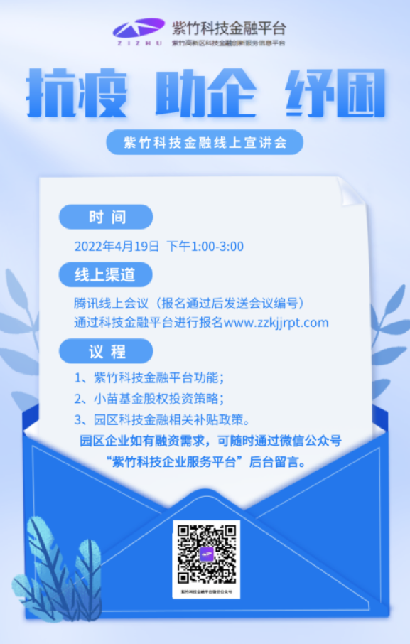 為助力高新區(qū)企業(yè)渡過疫情難關(guān),對接金融資源,了解高新區(qū)特色政策,2022年4月19日下午,由紫竹科技金融信息服務(wù)平臺、財務(wù)中心、小苗基金聯(lián)合舉辦的“抗疫·助企·紓困”線上宣講會通過騰訊會議平臺舉行,吸引了近90家入駐企業(yè)、銀行、高新區(qū)各部門的積極參與。