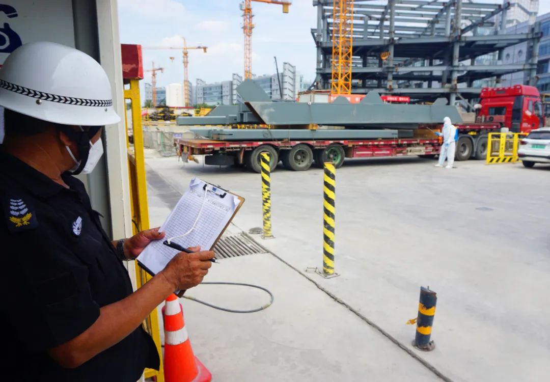 工地大門外,一輛工程運輸車正前來運送建材。安保人員及時上前,請司機(jī)完成“數(shù)字哨兵”掃碼、抗原自測、體溫檢測,并核實核酸陰性報告和登記車輛信息,并告知司機(jī)進(jìn)入施工區(qū)卸貨時非必要不下車。在完成一系列防疫要求后,方可進(jìn)入緩沖區(qū),對輪胎、車門等重點部位進(jìn)行全面消殺。