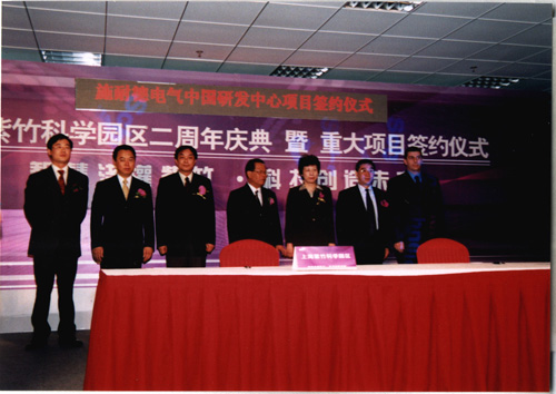 2004年6月26日,施耐德電器(中國)研發(fā)中心正式簽約入駐上海紫竹科學(xué)園區(qū),施耐德電器(中國)研發(fā)中心總經(jīng)理Mr.ClaudeGrelier與上海紫竹科學(xué)園區(qū)執(zhí)行副總經(jīng)理夏光先生在入駐協(xié)議上簽字