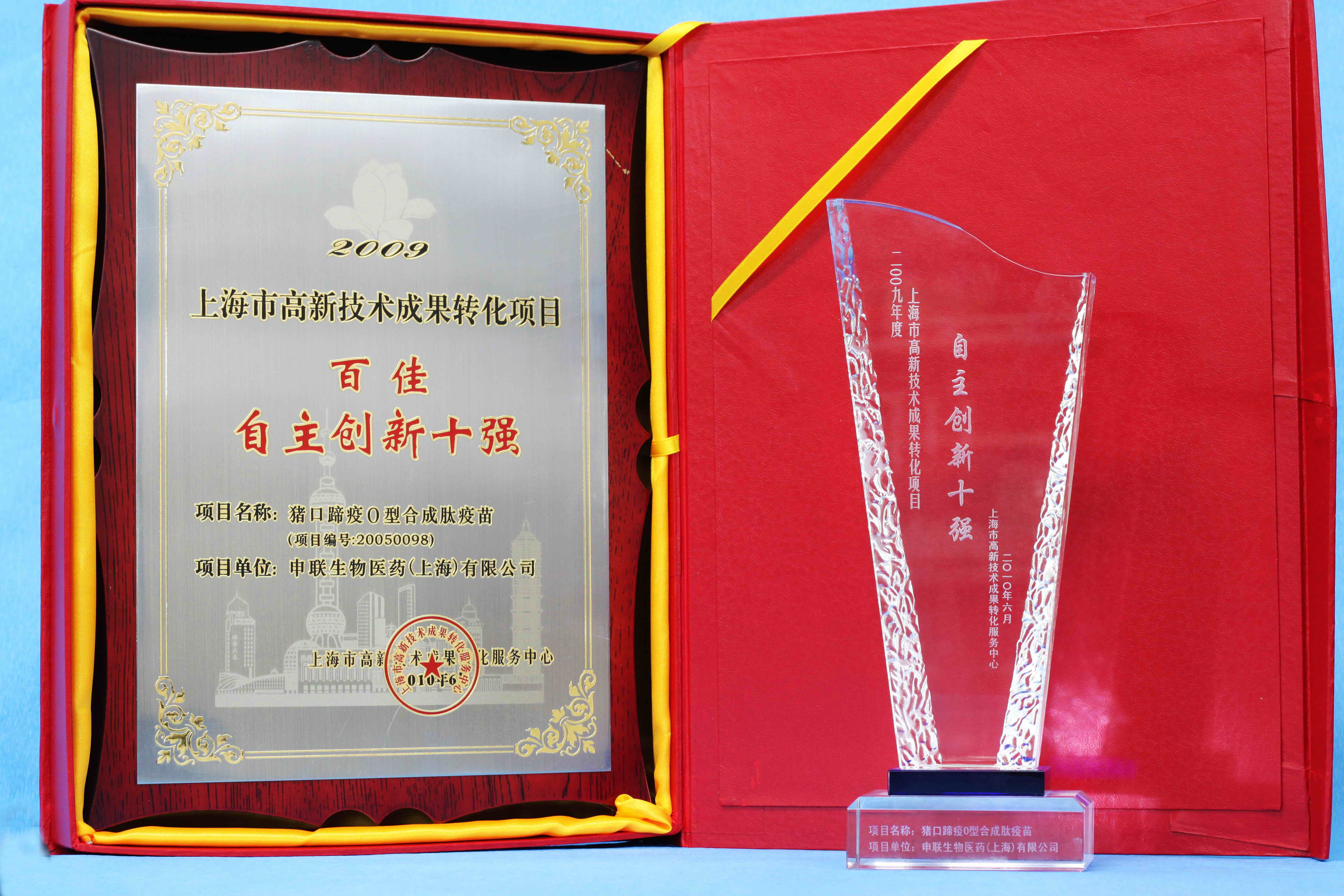 6月21日下午,在上海虹橋賓館召開的“2009年度高新技術(shù)成果轉(zhuǎn)化項(xiàng)目‘百佳’、自主創(chuàng)新‘十強(qiáng)’授牌表彰會(huì)”上,申聯(lián)生物醫(yī)藥(上海)有限公司的豬口蹄疫O型合成肽疫苗項(xiàng)目獲得“2009年度上海市高新技術(shù)成果轉(zhuǎn)化項(xiàng)目自主創(chuàng)新十強(qiáng)”稱號(hào)