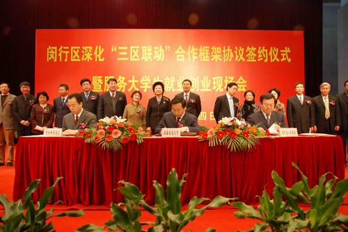 以“加強(qiáng)‘三區(qū)’合作,推進(jìn)區(qū)域融合”為主題的“閔行區(qū)深化‘三區(qū)聯(lián)動(dòng)’合作框架協(xié)議簽約儀式暨服務(wù)大學(xué)生就業(yè)創(chuàng)業(yè)”現(xiàn)場(chǎng)會(huì),2009年1月4日上午在紫竹科學(xué)園區(qū)華東師范大學(xué)體育館舉行