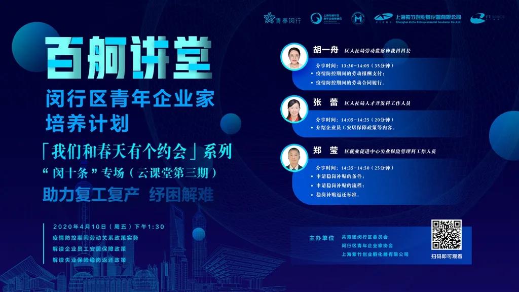 由團區(qū)委、區(qū)青企協(xié)、紫竹創(chuàng)業(yè)孵化器聯(lián)合發(fā)起的“百舸講堂”(第三期) 企業(yè)用工專場于2020年4月10日下午在人民網(wǎng)紫竹創(chuàng)業(yè)路演中心啟動。本次專場直播邀請了閔行區(qū)人社局勞動監(jiān)察仲裁科科長胡一舟、區(qū)人社局人才開發(fā)科張蕾、區(qū)就業(yè)促進中心失業(yè)保險管理科鄭瑩,為企業(yè)帶來相關(guān)“閔十條”有關(guān)企業(yè)用工方面的政策詳解,專場直播課程由創(chuàng)業(yè)孵化器總經(jīng)理丁嘉敏主持。