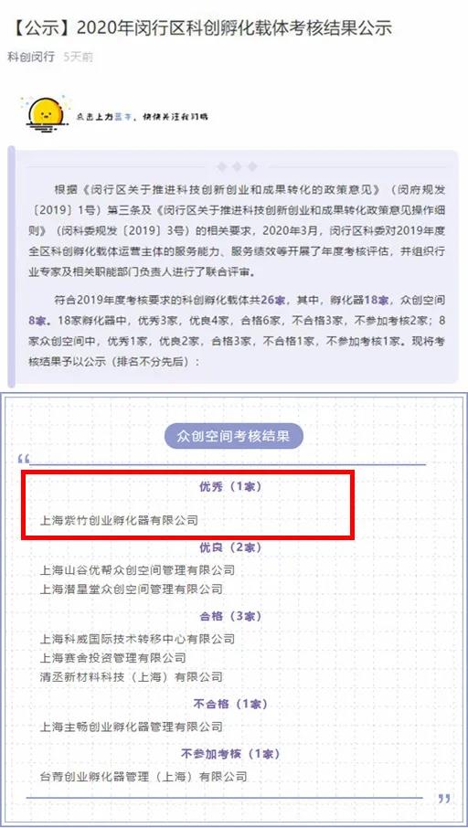 2020年4月8日,2019年閔行區(qū)眾創(chuàng)空間考核結(jié)果正式公布,紫竹創(chuàng)業(yè)孵化器連續(xù)第四年以優(yōu)異的成績榮登閔行區(qū)眾創(chuàng)空間考核(眾創(chuàng)空間組)第一名,成為全區(qū)眾創(chuàng)空間科創(chuàng)服務(wù)工作標(biāo)桿孵化器。