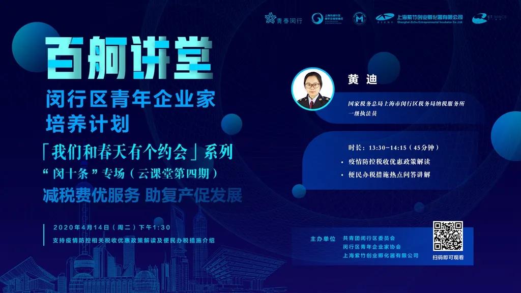 由團(tuán)區(qū)委、區(qū)青企協(xié)、紫竹創(chuàng)業(yè)孵化器聯(lián)合發(fā)起的“百舸講堂”(第四期) 減稅費(fèi)優(yōu)專場,于2020年4月14日下午在人民網(wǎng)紫竹創(chuàng)業(yè)路演中心開展。直播邀請了國家稅務(wù)總局上海市閔行區(qū)稅務(wù)局納稅服務(wù)所一級(jí)執(zhí)法員黃迪老師帶來有關(guān)“減稅費(fèi)有服務(wù)、助復(fù)產(chǎn)促發(fā)展”主題內(nèi)容,課程由紫竹孵化器總經(jīng)理丁嘉敏主持。