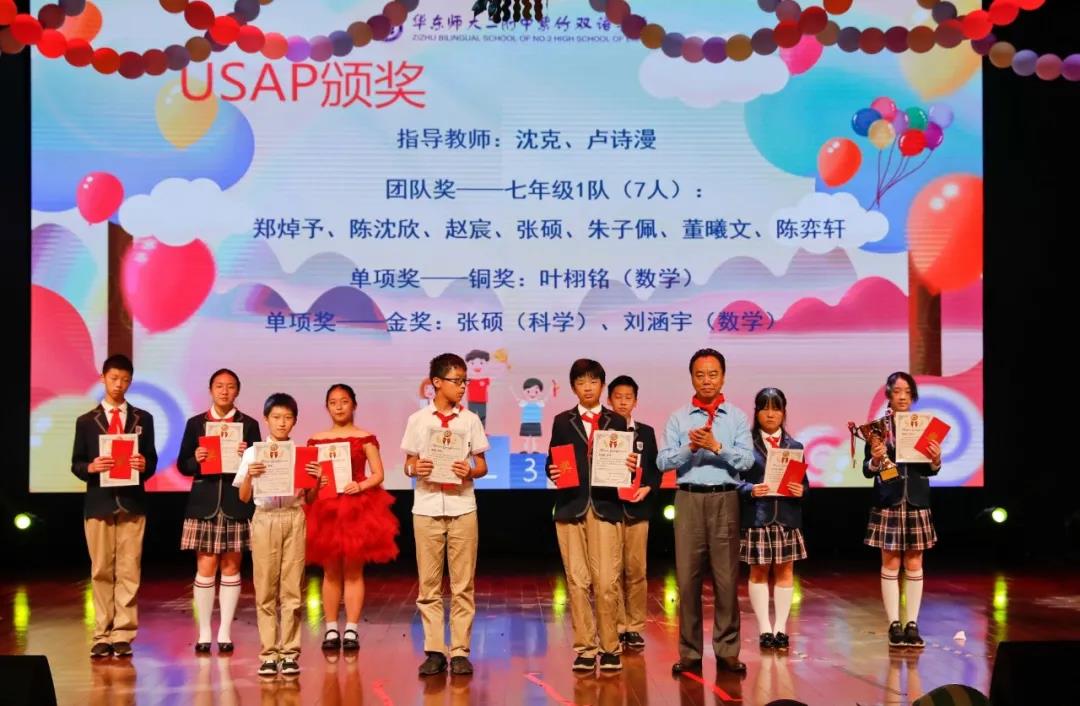 演出后,一批優(yōu)秀少先隊(duì)員和班集體受到表彰。沈雯理事長親自為此前在國際學(xué)術(shù)五項(xiàng)全能中國站比賽中獲二金一銅單項(xiàng)獎(jiǎng)的三位同學(xué)和華東區(qū)總分金獎(jiǎng)并晉升全球賽的七位同學(xué)頒獎(jiǎng)。