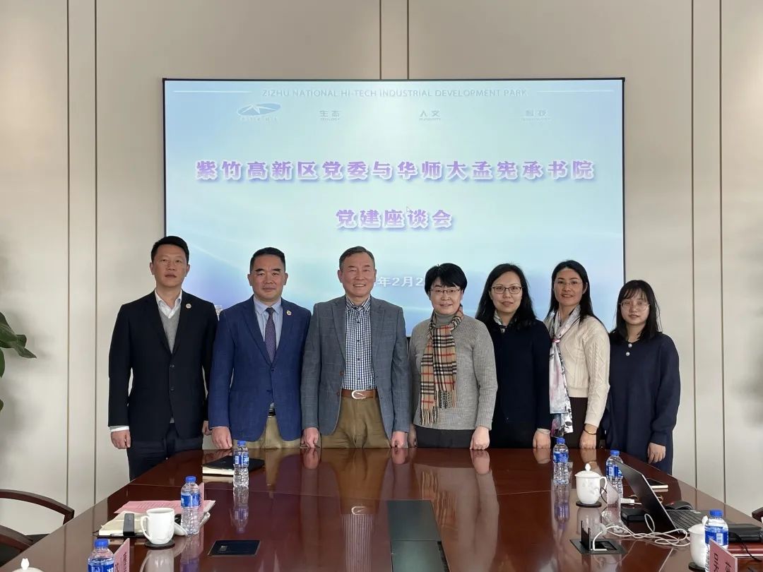 2月28日,紫竹高新區(qū)黨委與華師大孟憲承書院黨建座談會在紫竹高新區(qū)本部2樓4號會議室進(jìn)行。紫竹高新區(qū)黨委書記、副總經(jīng)理駱山鷹、副書記錢明華、黨辦主任王峰、副主任王彥,孟憲承書院黨委書記兼院長吳薇、副書記萬姍姍等出席本次座談會。會議由紫竹高新區(qū)黨委副書記錢明華主持。