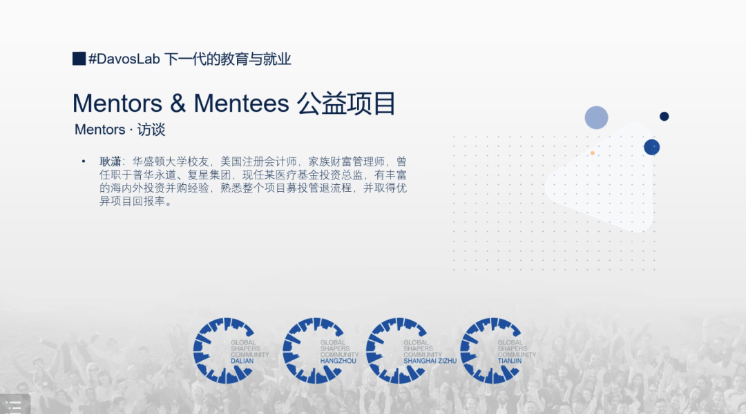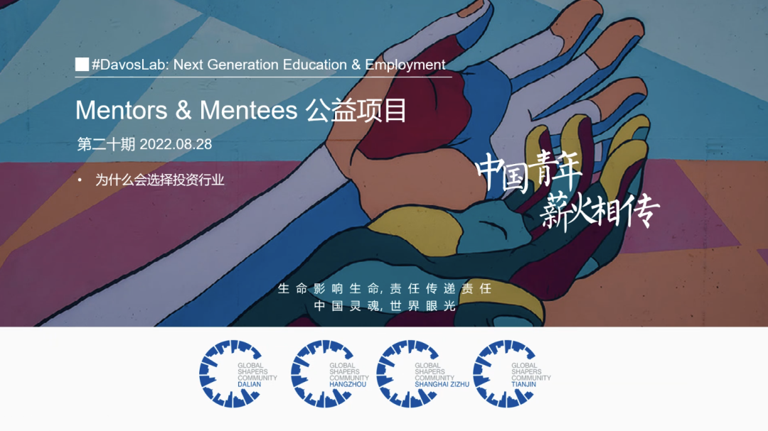 2022年8月28日晚,Mentors & Mentees 公益項目(中國青年 薪火相傳)第二十期在莘莘學子即將重新踏入校園之際,再一次在線上和大家見面。本期由紫竹杰青社區(qū)、大連社區(qū)、天津社區(qū)、杭州社區(qū)聯(lián)合主辦,邀請醫(yī)療領域資深投資總監(jiān)耿瀟導師擔任分享嘉賓,與主持人舒晨曦一同就“為什么會選擇投資行業(yè)”主題和大家分享。
