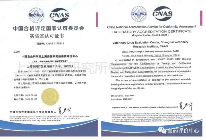 近日,中國(guó)農(nóng)業(yè)科學(xué)院上海獸醫(yī)研究所獸藥評(píng)價(jià)中心喜獲中國(guó)合格評(píng)定國(guó)家認(rèn)可委員會(huì)(CNAS)頒發(fā)的實(shí)驗(yàn)室認(rèn)可證書。