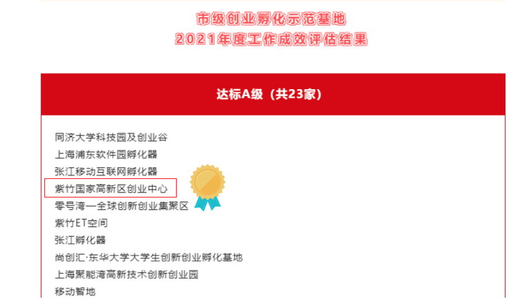 近期,上海市就業(yè)促進(jìn)中心公布了市級(jí)創(chuàng)業(yè)孵化示范基地2021年工作成效評(píng)估結(jié)果,紫竹國家高新區(qū)創(chuàng)業(yè)中心(運(yùn)營單位:上海紫竹創(chuàng)業(yè)投資有限公司)第四年蟬聯(lián)工作成效評(píng)估A級(jí)等第,評(píng)估考核總分名列全市前茅。
