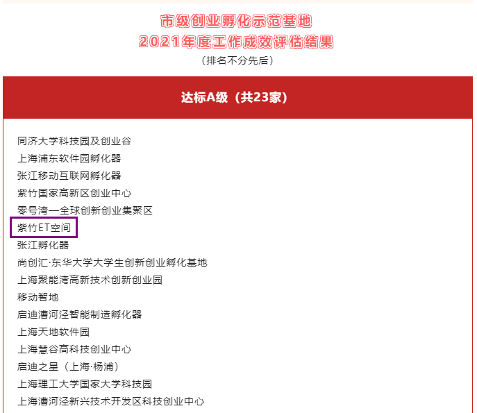 近日,上海市人社局市級(jí)創(chuàng)業(yè)孵化示范基地2021年度工作成效評(píng)估結(jié)果正式公布,紫竹ET空間以優(yōu)異的孵化業(yè)績在本次考核評(píng)估中名列前茅,位列眾創(chuàng)空間組全市第一,連續(xù)四年榮獲市級(jí)創(chuàng)業(yè)孵化示范基地A級(jí)園區(qū)稱號(hào),同時(shí)也是閔行區(qū)唯一一家連續(xù)四年獲得A類評(píng)定的眾創(chuàng)空間,彰顯紫竹科創(chuàng)服務(wù)實(shí)力。