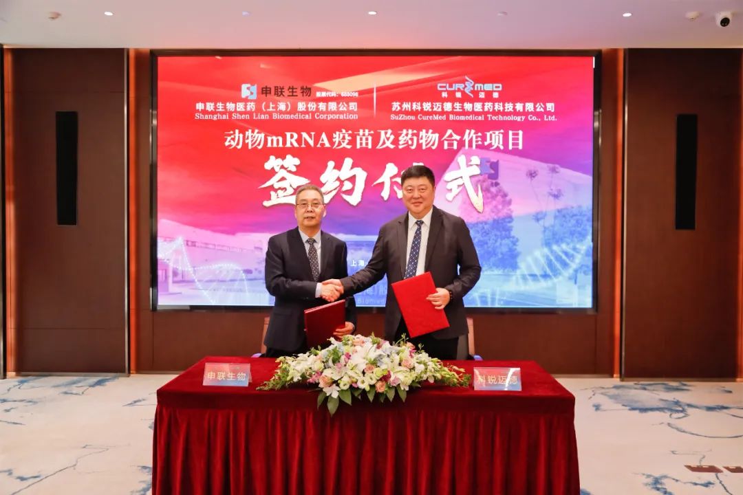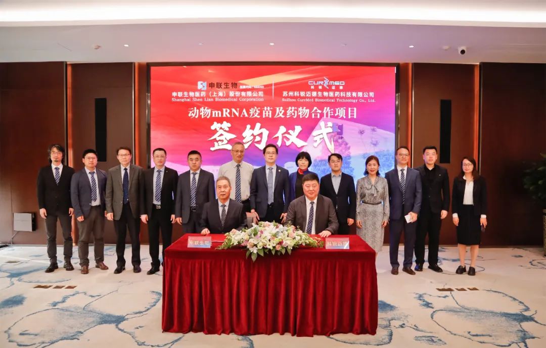 2023年4月18日,申聯(lián)生物醫(yī)藥(上海)股份有限公司與蘇州科銳邁德生物醫(yī)藥科技有限公司在紫竹高新區(qū)舉行“動(dòng)物mRNA疫苗及藥物合作項(xiàng)目”簽約儀式。紫竹高新區(qū)管委會(huì)副主任、高新區(qū)常務(wù)副總經(jīng)理夏光,高新區(qū)招商總監(jiān)任曼,申聯(lián)生物董事長聶東升,科銳邁德董事長劉毅翔及雙方項(xiàng)目相關(guān)核心人員出席了儀式。