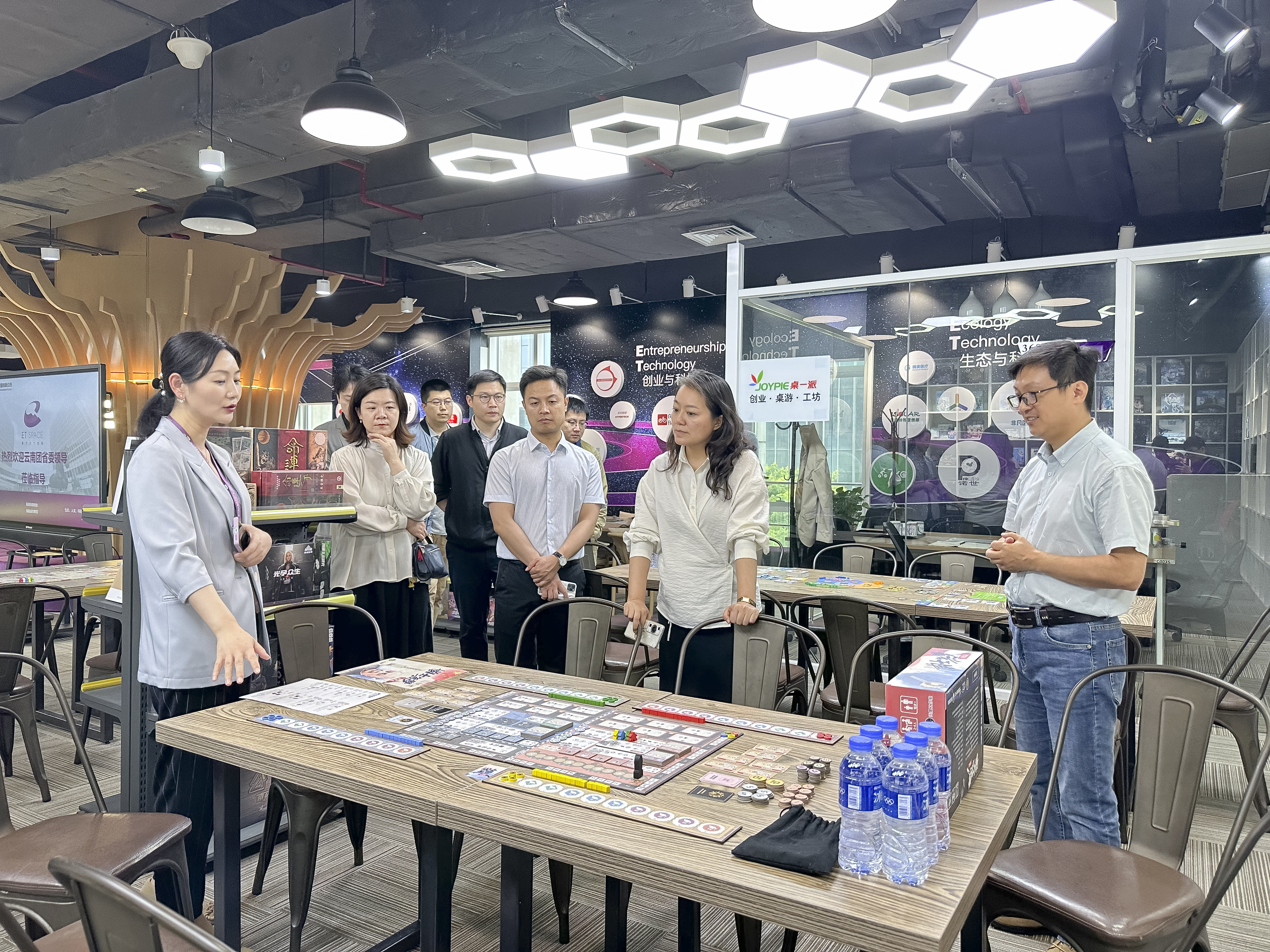 許思思副書記一行參觀了紫竹創(chuàng)業(yè)孵化器(ET空間),零距離體驗高新區(qū)青年創(chuàng)業(yè)孵化的全過程,聽取了丁嘉敏總經(jīng)理對ET空間孵化理念和特色產(chǎn)業(yè)培育、青年創(chuàng)業(yè)等情況的介紹。參觀過程中,大家體驗了由閔行共青團、紫竹團委與創(chuàng)業(yè)企業(yè)卓百文化三方聯(lián)合開發(fā)的紅色桌游產(chǎn)品《青年之路》等,感受到共青團鼓勵青年創(chuàng)新、服務(wù)青年創(chuàng)業(yè)的濃厚氛圍。大家在創(chuàng)業(yè)企業(yè)境騰科技體驗虛擬現(xiàn)實的科技產(chǎn)品,對話創(chuàng)業(yè)青年。鄭曉珺副書記介紹到,閔行和紫竹是青年創(chuàng)業(yè)的沃土,創(chuàng)業(yè)青年們可以在共青團和孵化器“善搭平臺、提升服務(wù)、強化政策”而營造的良好創(chuàng)新生態(tài)下不斷拼搏、穩(wěn)步成長。