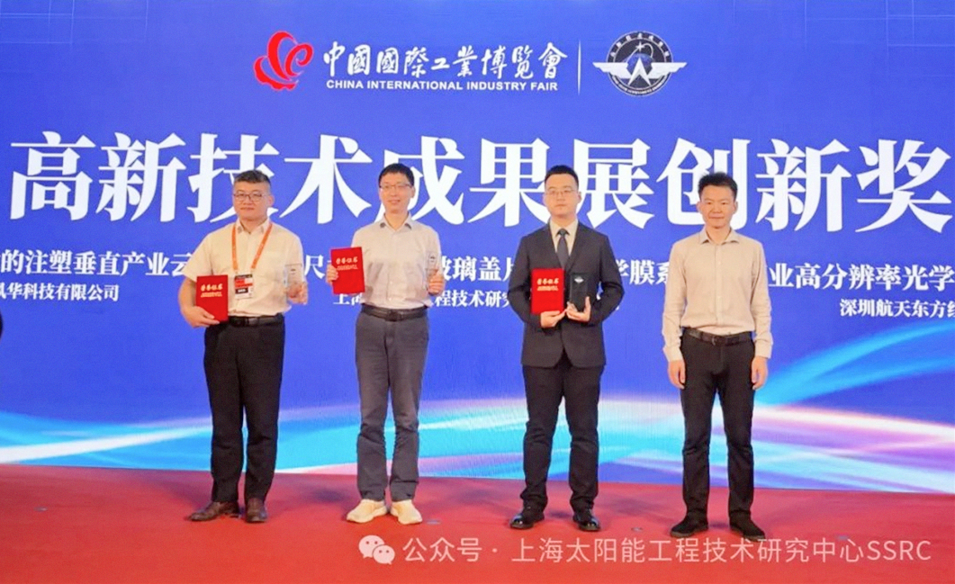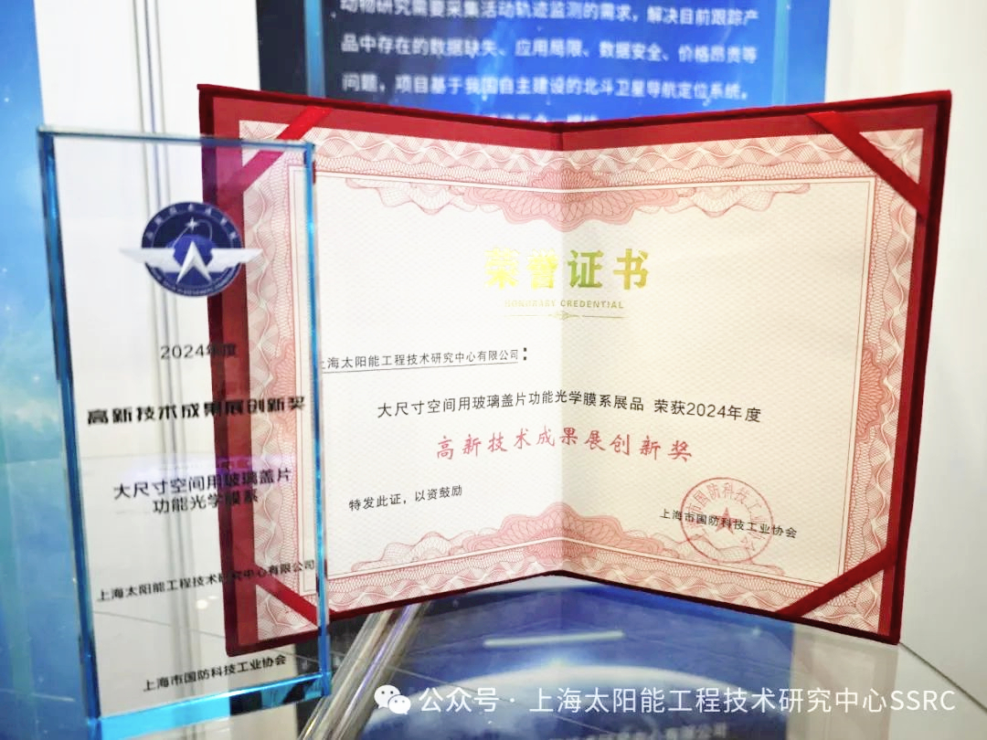2024年9月24日,第二十四屆中國國際工業(yè)博覽會(huì)開幕當(dāng)日,在由上海市國防科技工業(yè)協(xié)會(huì)負(fù)責(zé)的高新技術(shù)成果展區(qū)中舉行了高新技術(shù)成果展頒獎(jiǎng)儀式。上海太陽能工程技術(shù)研究中心有限公司申報(bào)的“大尺寸空間用玻璃蓋片功能光學(xué)膜系”展品榮獲“高新技術(shù)成果展創(chuàng)新獎(jiǎng)”,公司副總經(jīng)理?xiàng)钫苛执砉镜桥_(tái)領(lǐng)獎(jiǎng)。