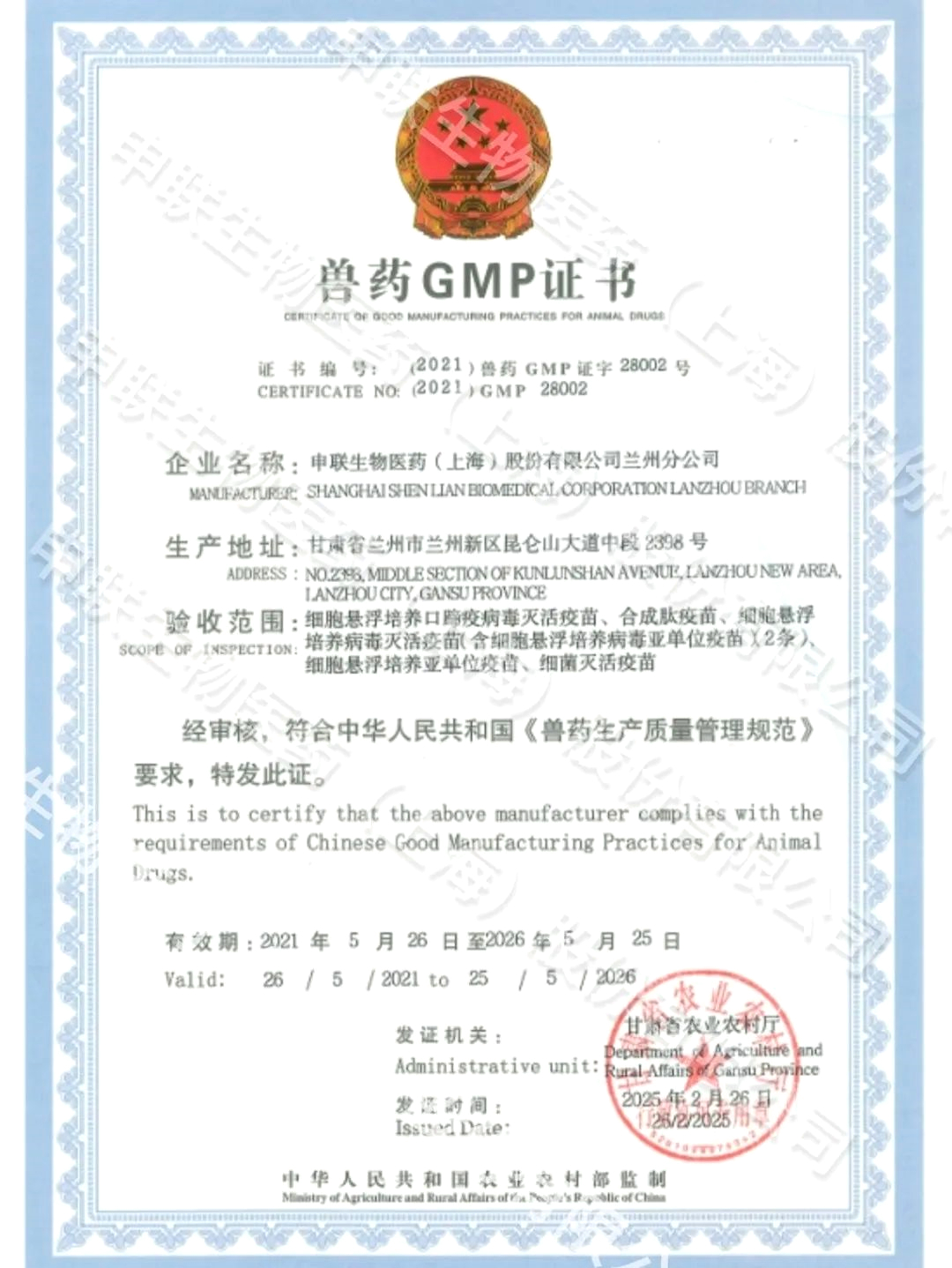 2025年2月26日,申聯(lián)生物醫(yī)藥(上海)股份有限公司蘭州分公司取得甘肅省農(nóng)業(yè)農(nóng)村廳新核發(fā)的《獸藥GMP證書》和《獸藥生產(chǎn)許可證》。