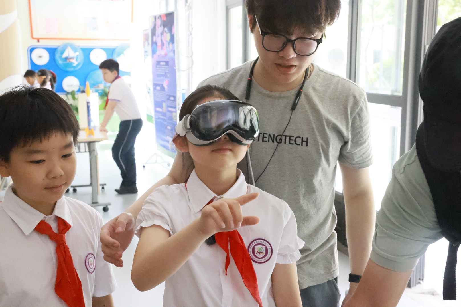 2025年5月19日下午,華東師范大學(xué)附屬紫竹小學(xué)Z2科博館迎來了第三期的展覽活動(dòng),此次展覽的主題是關(guān)于太空與藝術(shù)的“星際想象”。經(jīng)紫竹高新區(qū)團(tuán)委牽線,來自紫竹ET空間孵化企業(yè)境騰科技來到紫竹小學(xué),為此次展覽帶來了科技產(chǎn)品MR(混合現(xiàn)實(shí))眼鏡設(shè)備,將藝術(shù)課堂裝進(jìn)黑科技中,通過人工智能賦能數(shù)字美育新實(shí)踐。