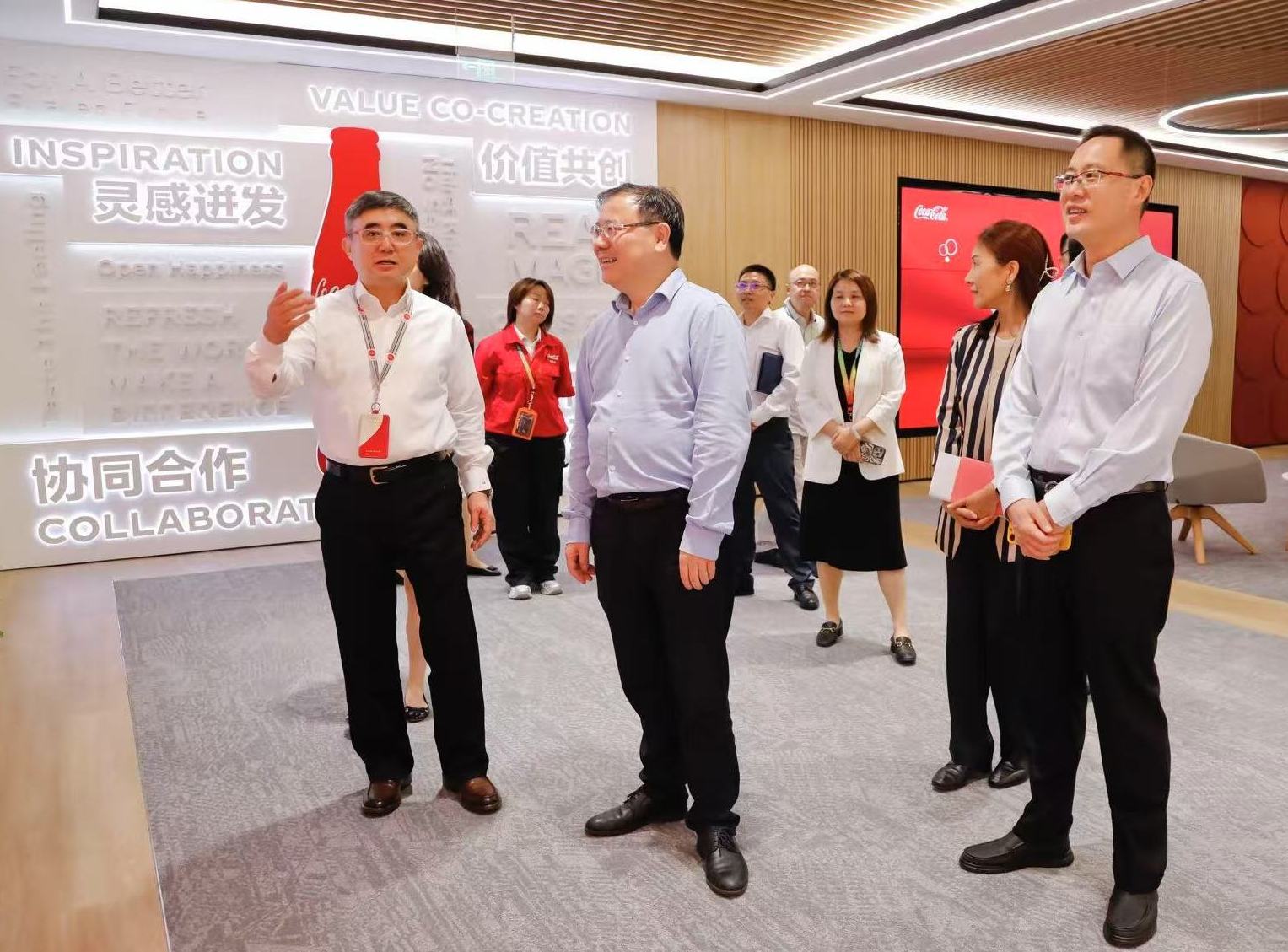 吳強代理區(qū)長首先參觀了可口可樂中國協(xié)作中心,聽取企業(yè)負責人關于產(chǎn)品矩陣、企業(yè)社會責任和可持續(xù)發(fā)展等方面的介紹。
