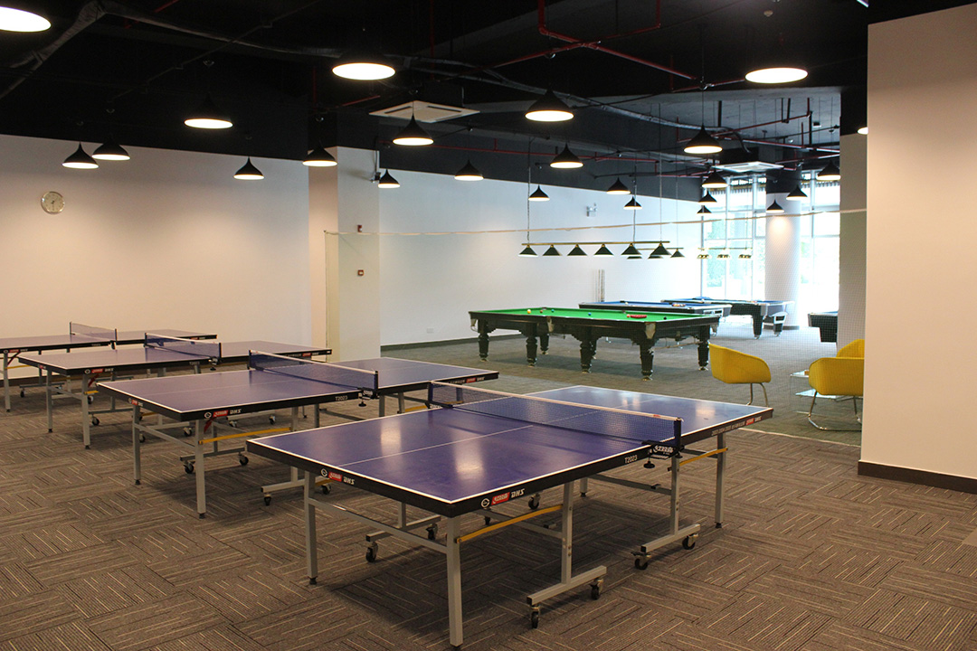 桌球、乒乓球室配備有4臺乒乓球桌、4臺美式九球桌和1臺斯諾克球桌,并配有小型休閑服務(wù)區(qū)為園區(qū)客戶提供休閑,放松的空間。